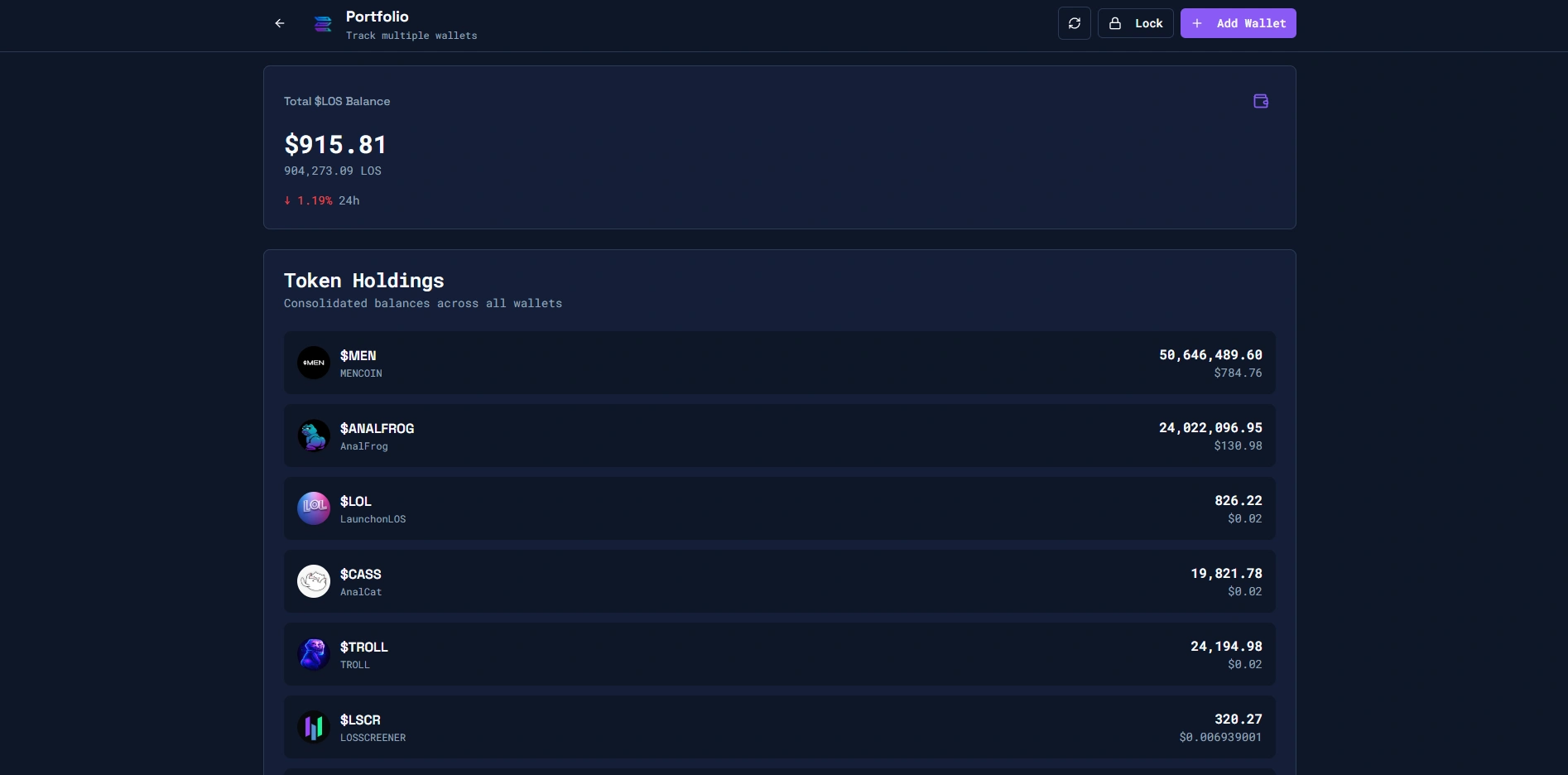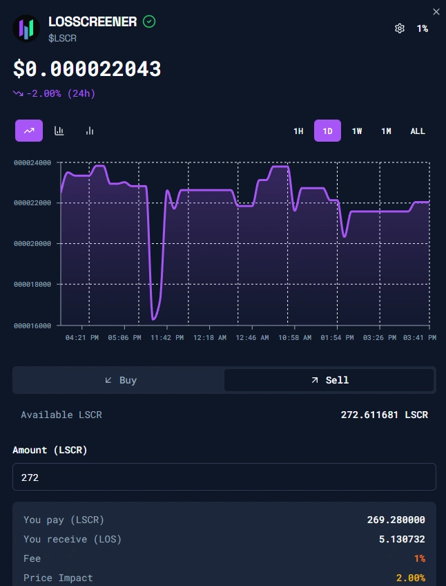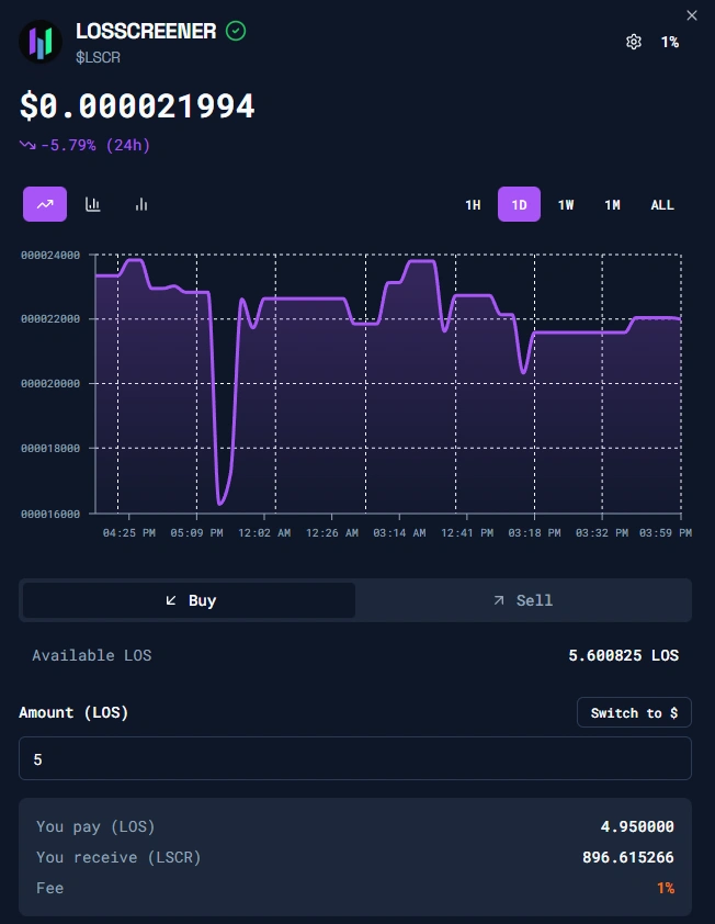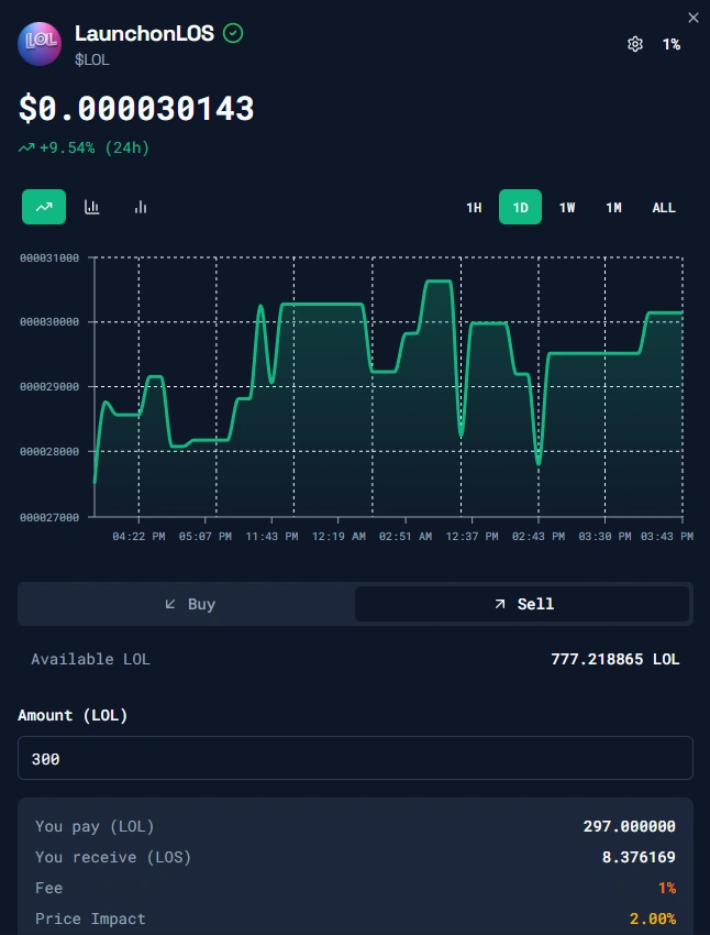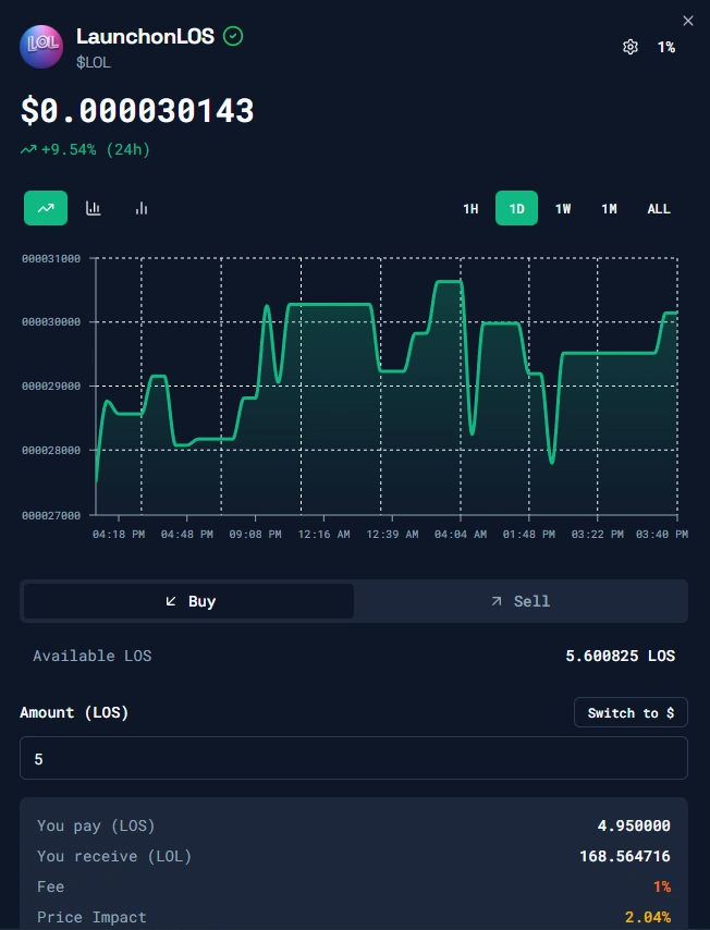 Quickly view current price of a token, and trade against $LOS. With quick quote features and buy/sell facility in app. Stunning chart visuals to view token progress over time or track progress. A small transaction fee of 1% helps support development of this DApp.