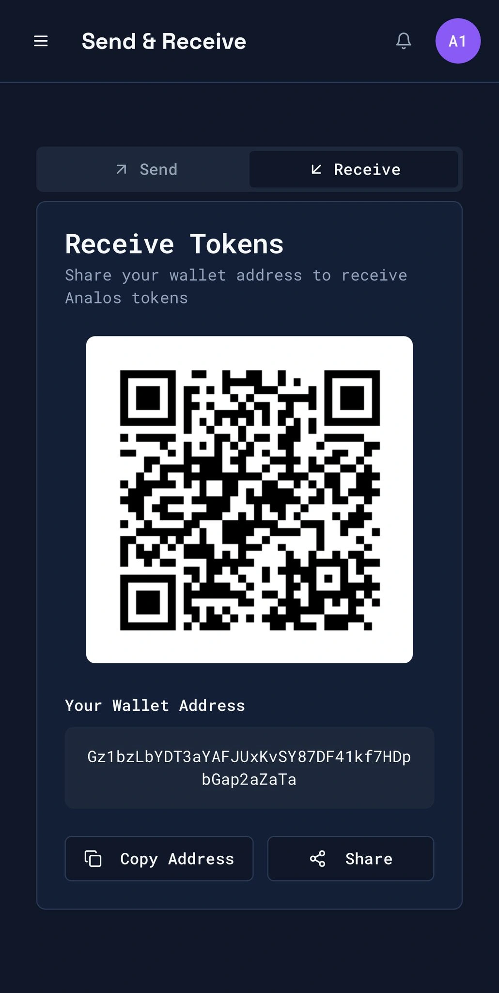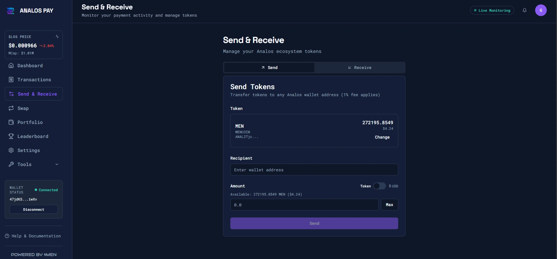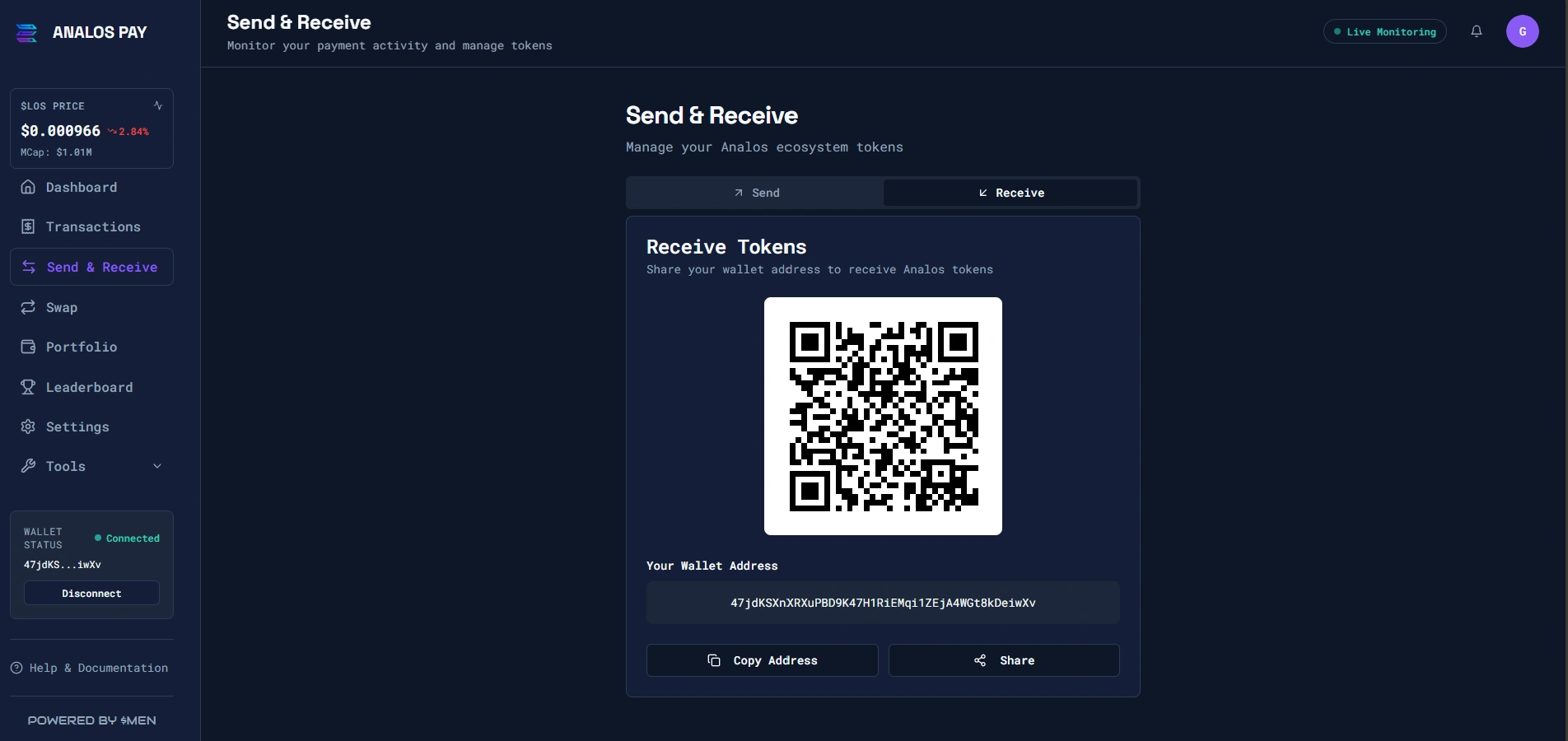 Send funds directly from Analos Pay to users on the Analos blockchain. Select which token you would like to send from the drop down and send. Built in QR scanner for in person payments and receive tab displaying your QR code and wallet address.