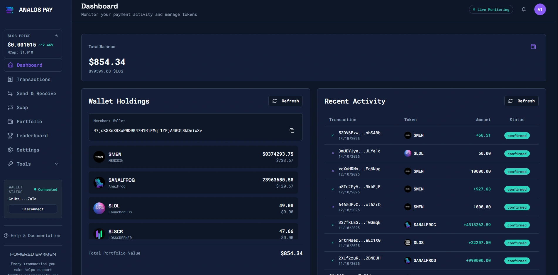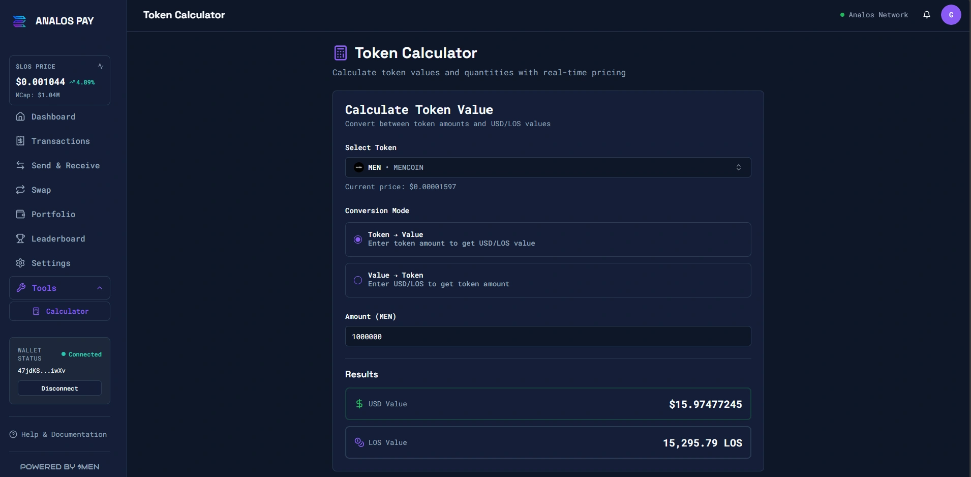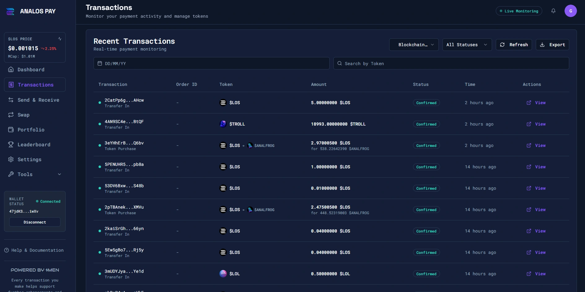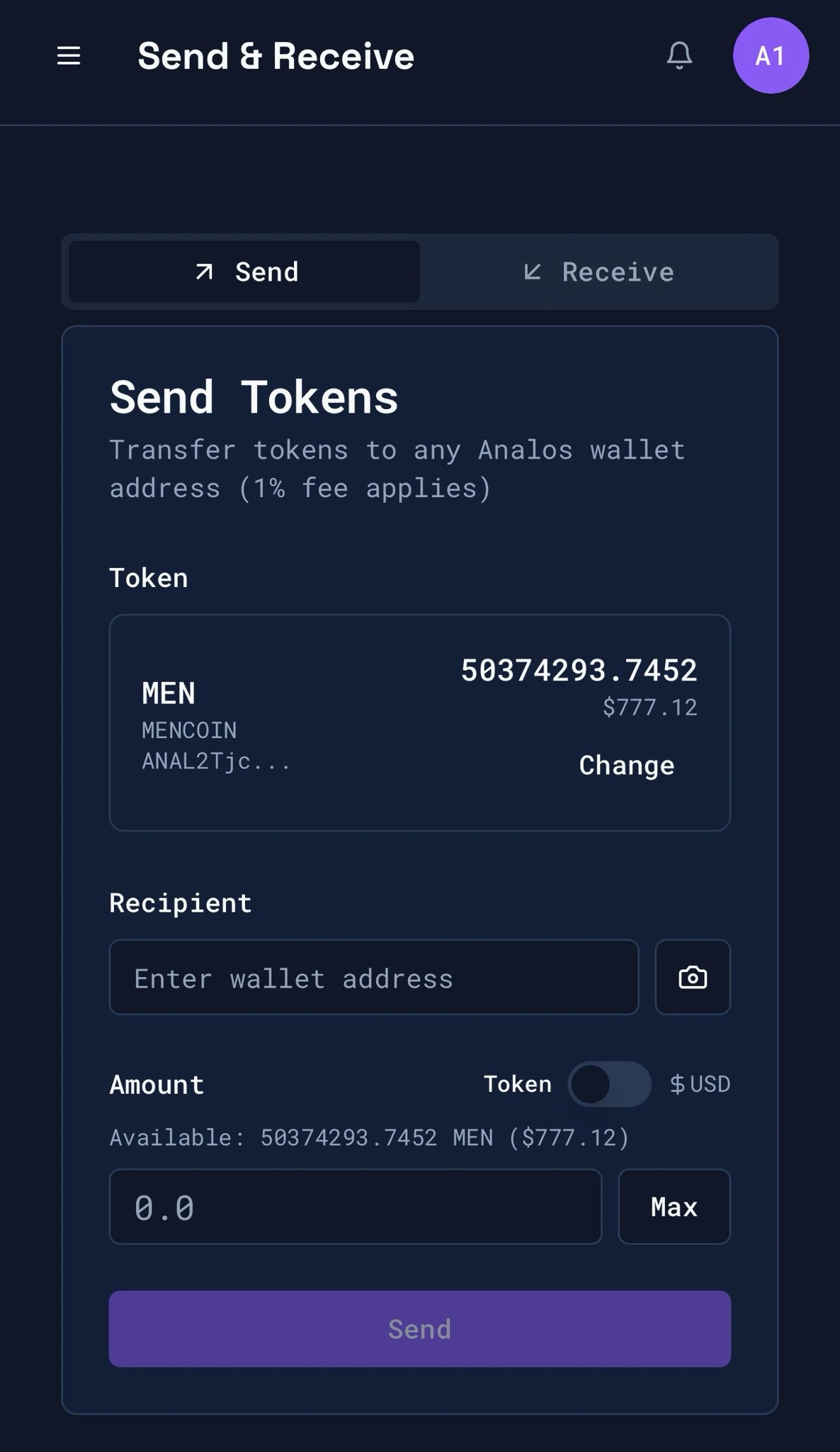 Send funds directly from Analos Pay to users on the Analos blockchain. Select which token you would like to send from the drop down and send. Built in QR scanner for in person payments and receive tab displaying your QR code and wallet address.